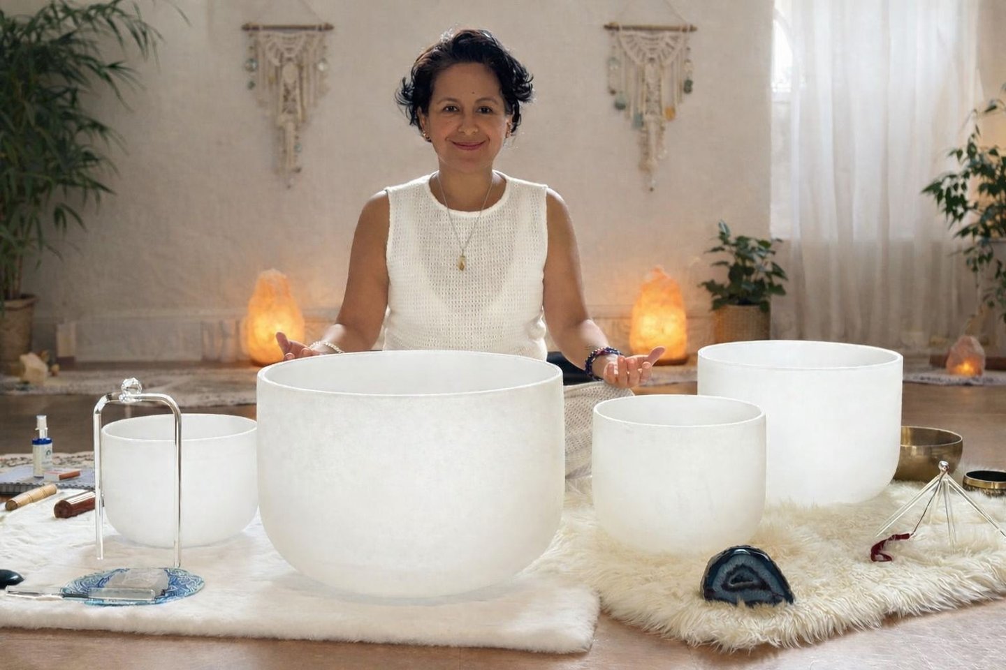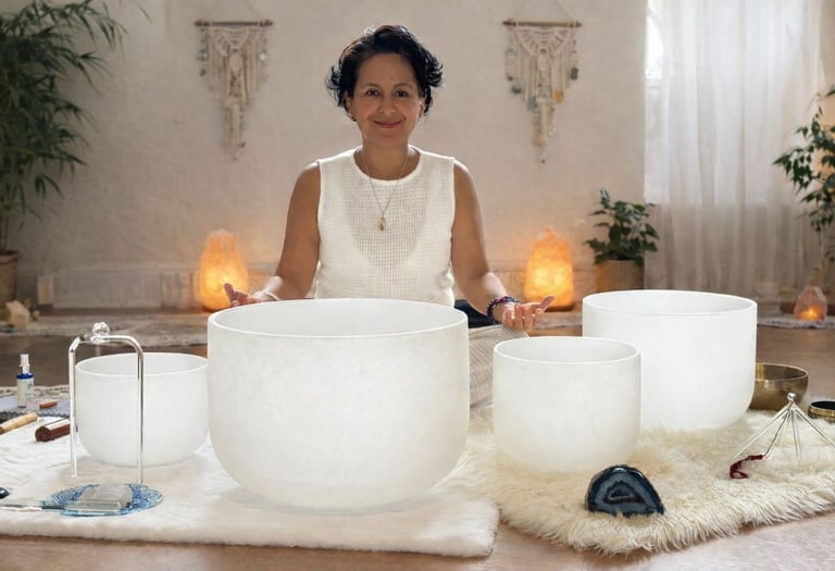 Guía certificada en meditaciones con cuencos de cristal, una práctica accesible para todos que no requiere experiencia previa.